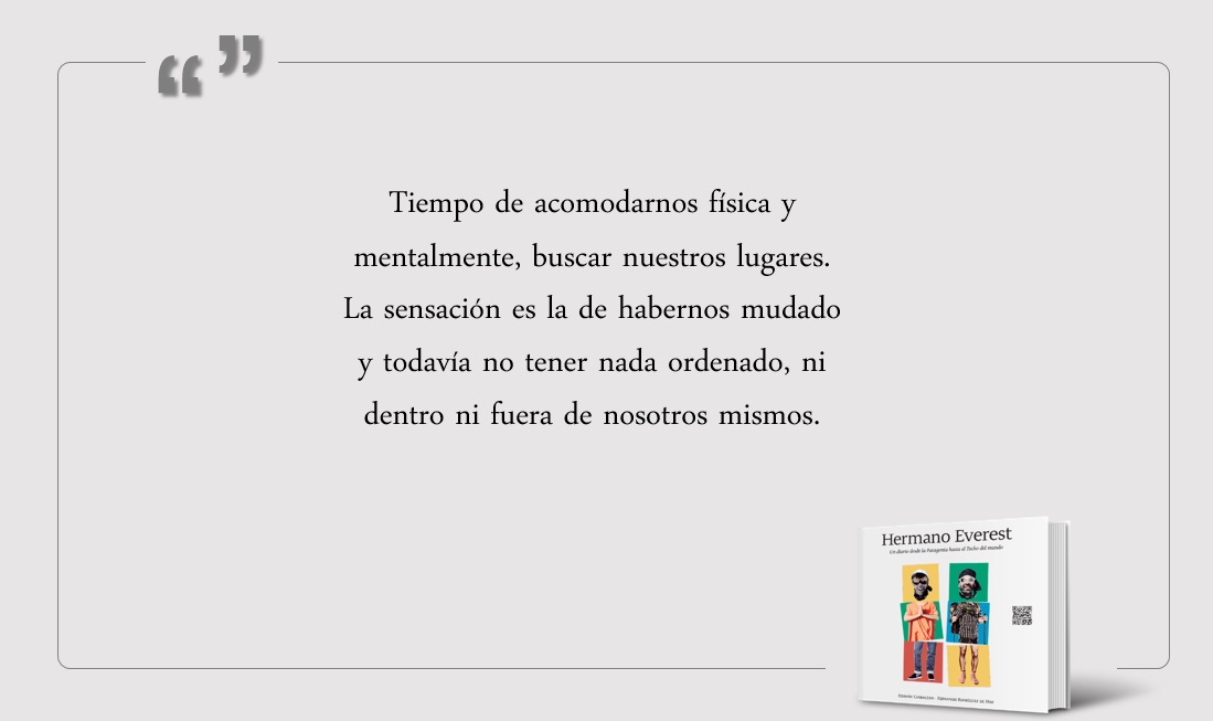 Últimas horas antes de llegar a la futura casa. Luego de una interminable subida la vista descubre "la ciudad de tela", y la emoción no puede ser mayor. Hora de instalarse para los próximos cincuenta días.