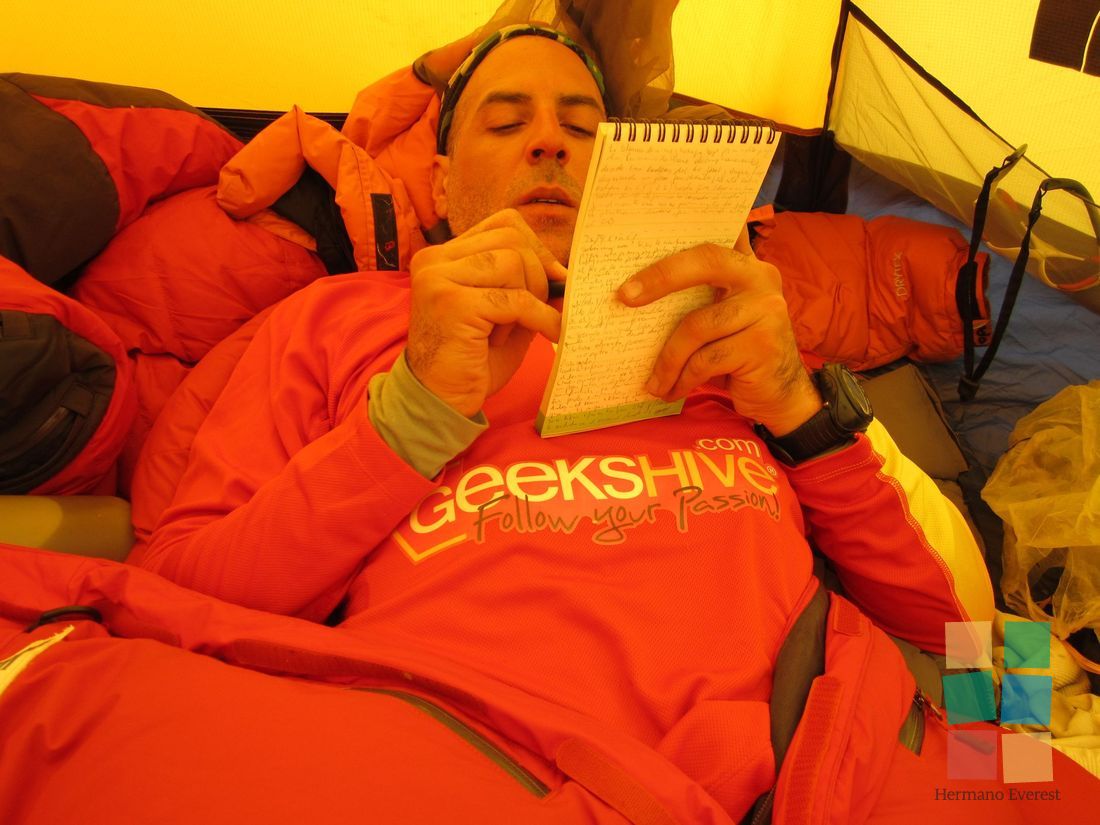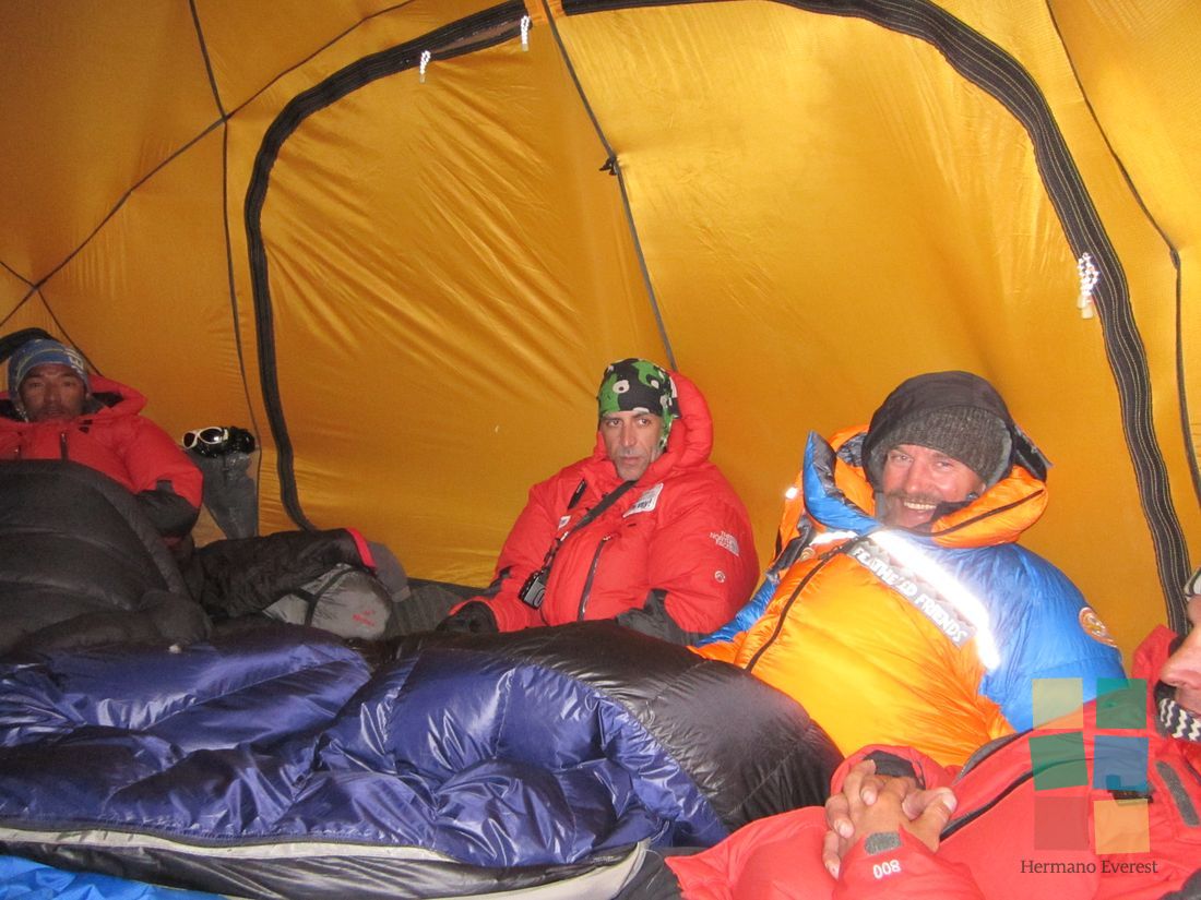Hoy hay que llegar a Campo 3 y dormir allí, en una carpa apenas sujeta sobre la Cara del Lhotse, con su pendiente de más de mil metros de puro hielo. ¿Para quién escribe Fer? Cinco en una carpa para tres: la tarde discurrió entre chistes, risas y las típicas e irreproducibles charlas de varones. El equipo de oxígeno se torna necesario.