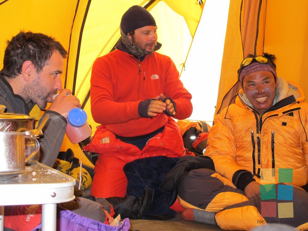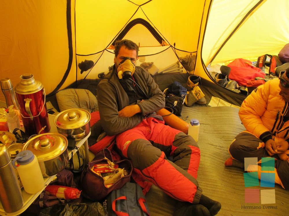 Hoy hay que llegar a Campo 3 y dormir allí, en una carpa apenas sujeta sobre la Cara del Lhotse, con su pendiente de más de mil metros de puro hielo. ¿Para quién escribe Fer? Cinco en una carpa para tres: la tarde discurrió entre chistes, risas y las típicas e irreproducibles charlas de varones. El equipo de oxígeno se torna necesario.