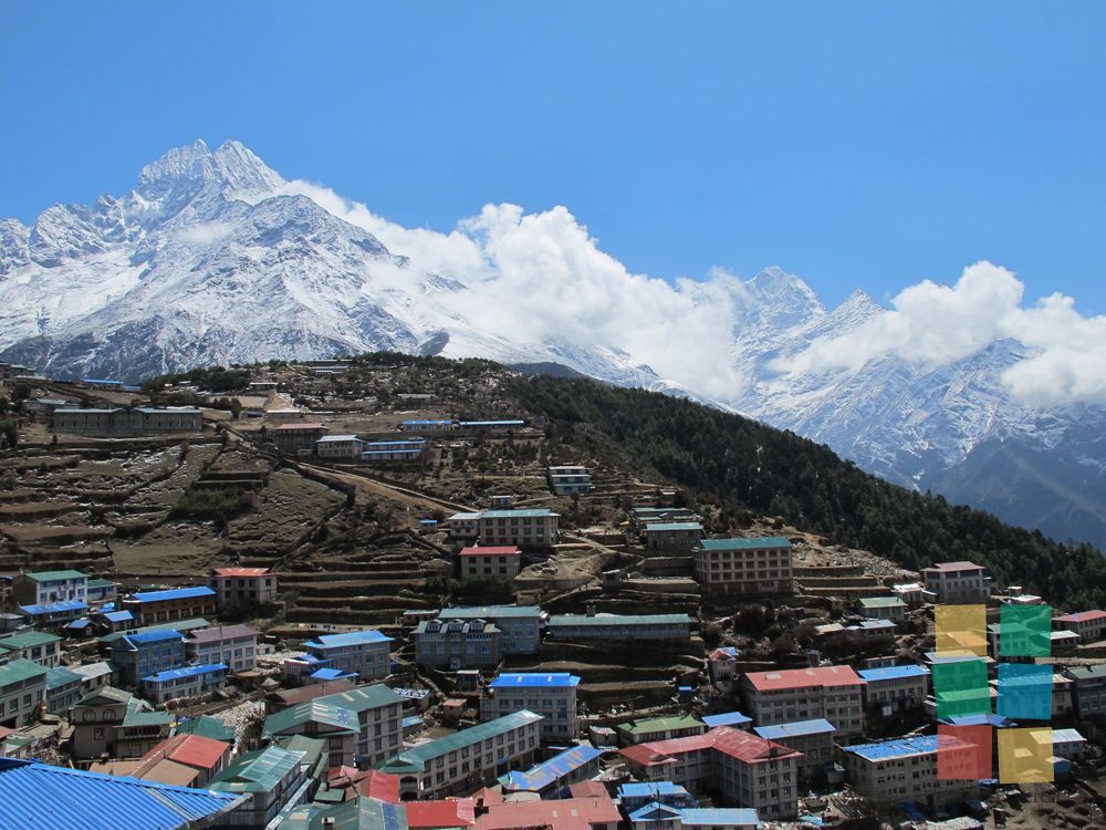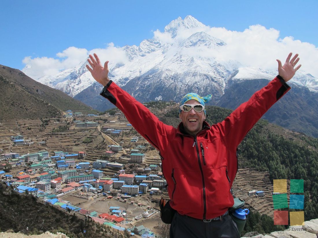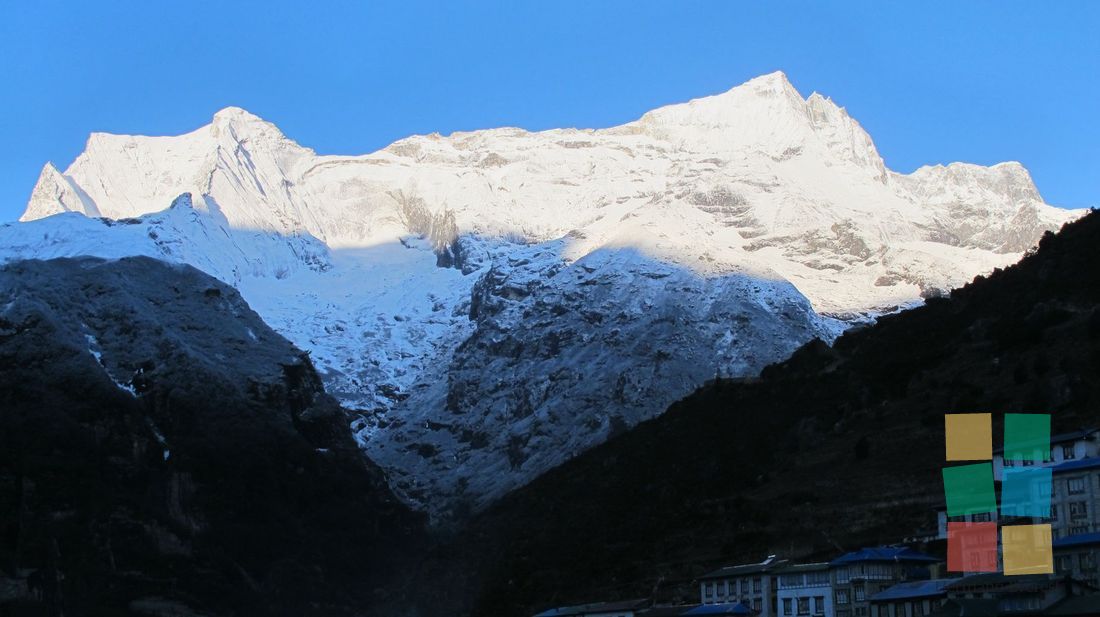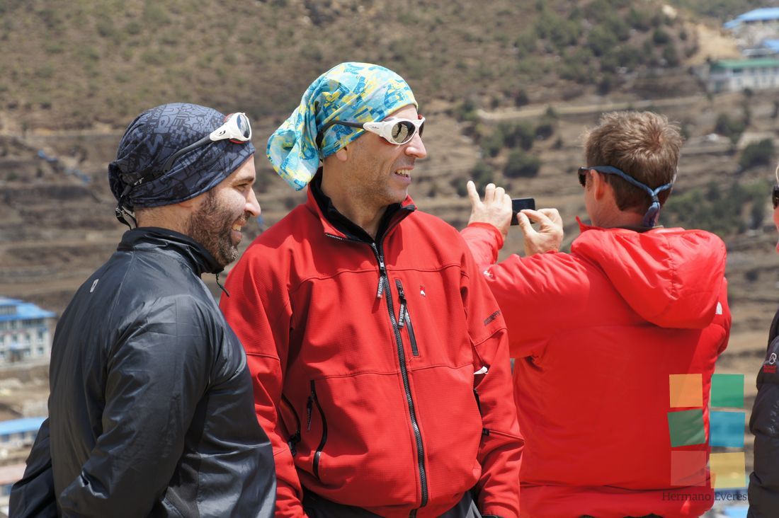 El trekking al Campo Base resulta sorprendente a cada paso. El balanceo de los puentes colgantes produce sensaciones encontradas: diversión, temor, fascinación... Namche Bazar recibe al grupo de un modo muy particular. ¡Otro día magnífico!