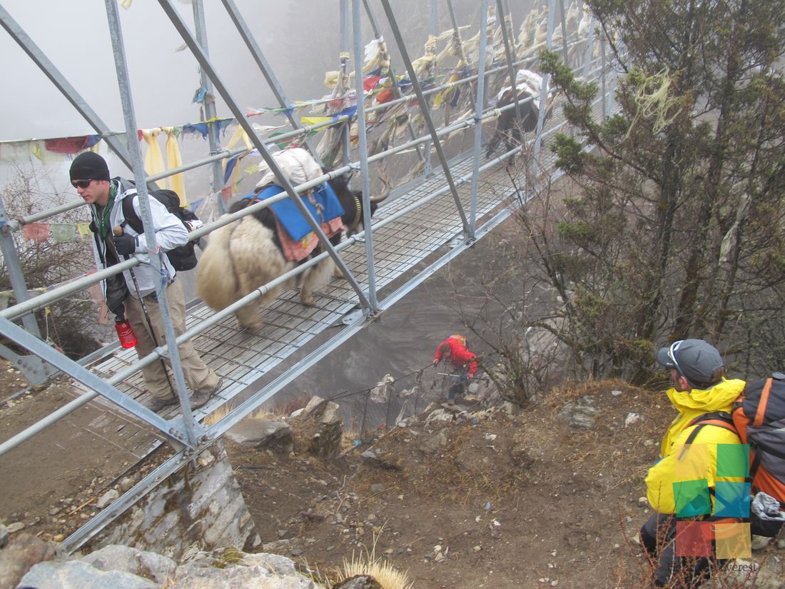 El trekking al Campo Base resulta sorprendente a cada paso. El balanceo de los puentes colgantes produce sensaciones encontradas: diversión, temor, fascinación... Namche Bazar recibe al grupo de un modo muy particular. ¡Otro día magnífico!